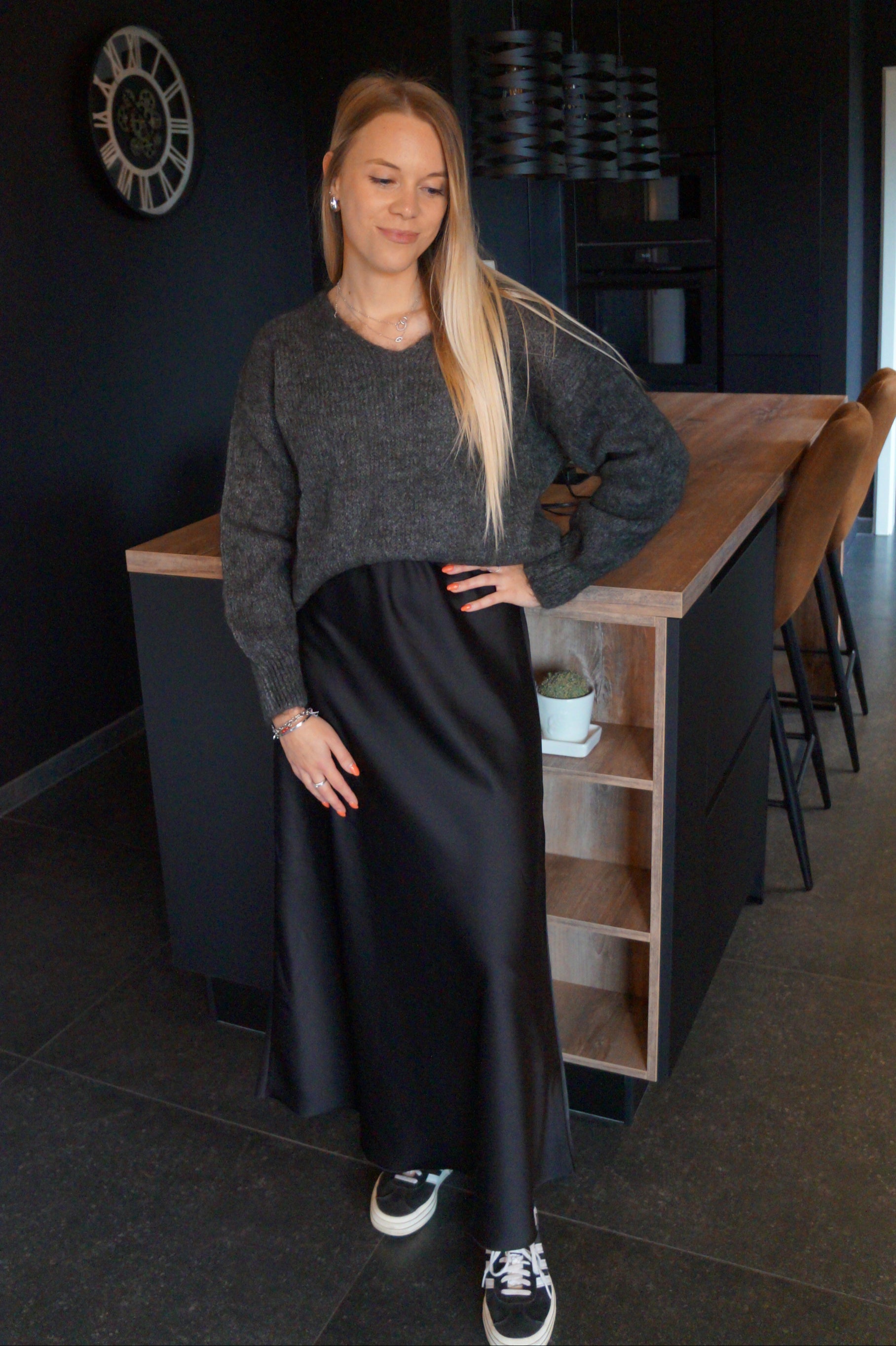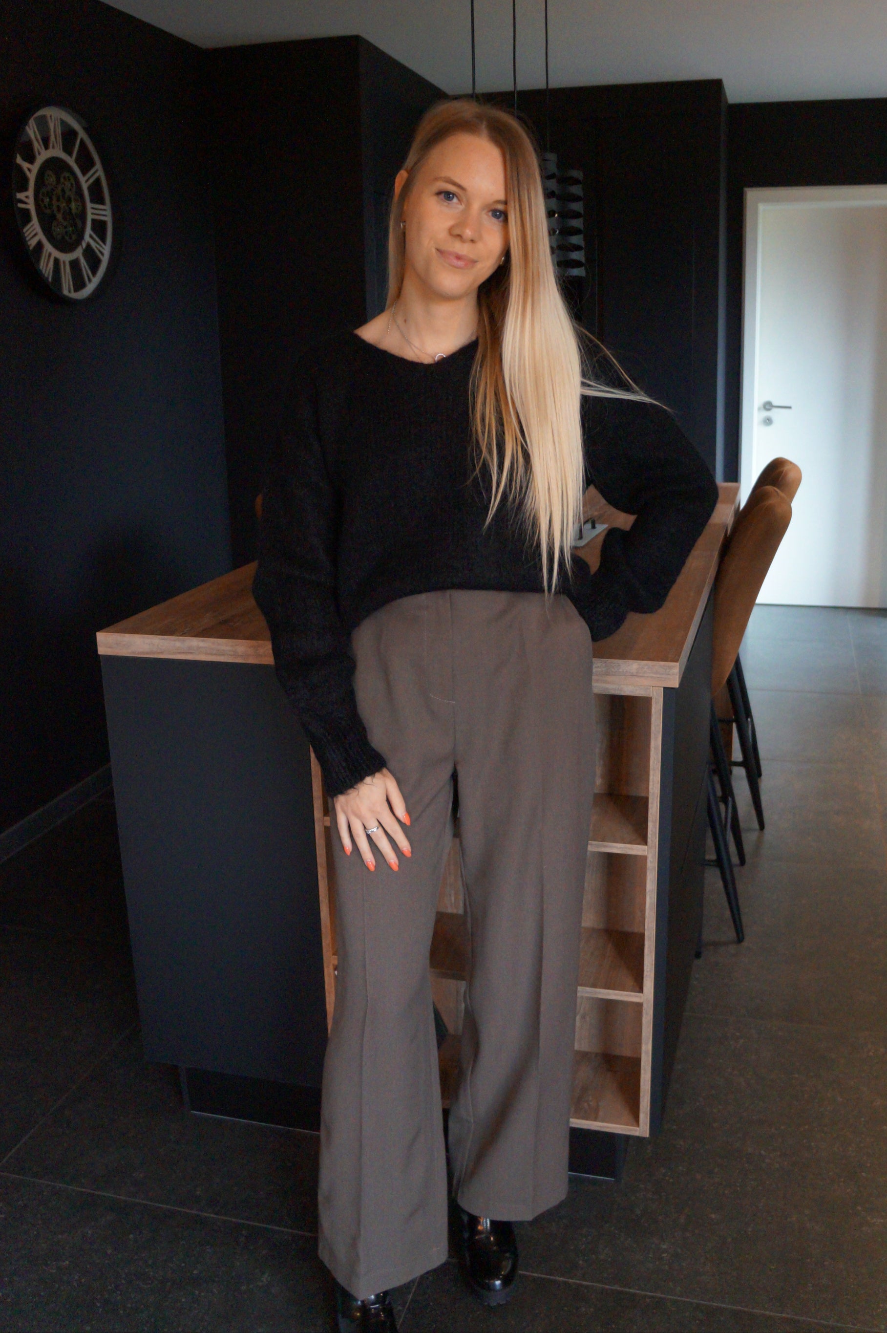 - Notre modèle porte également notre pantalon Daphné en taupe et notre jupe Constance