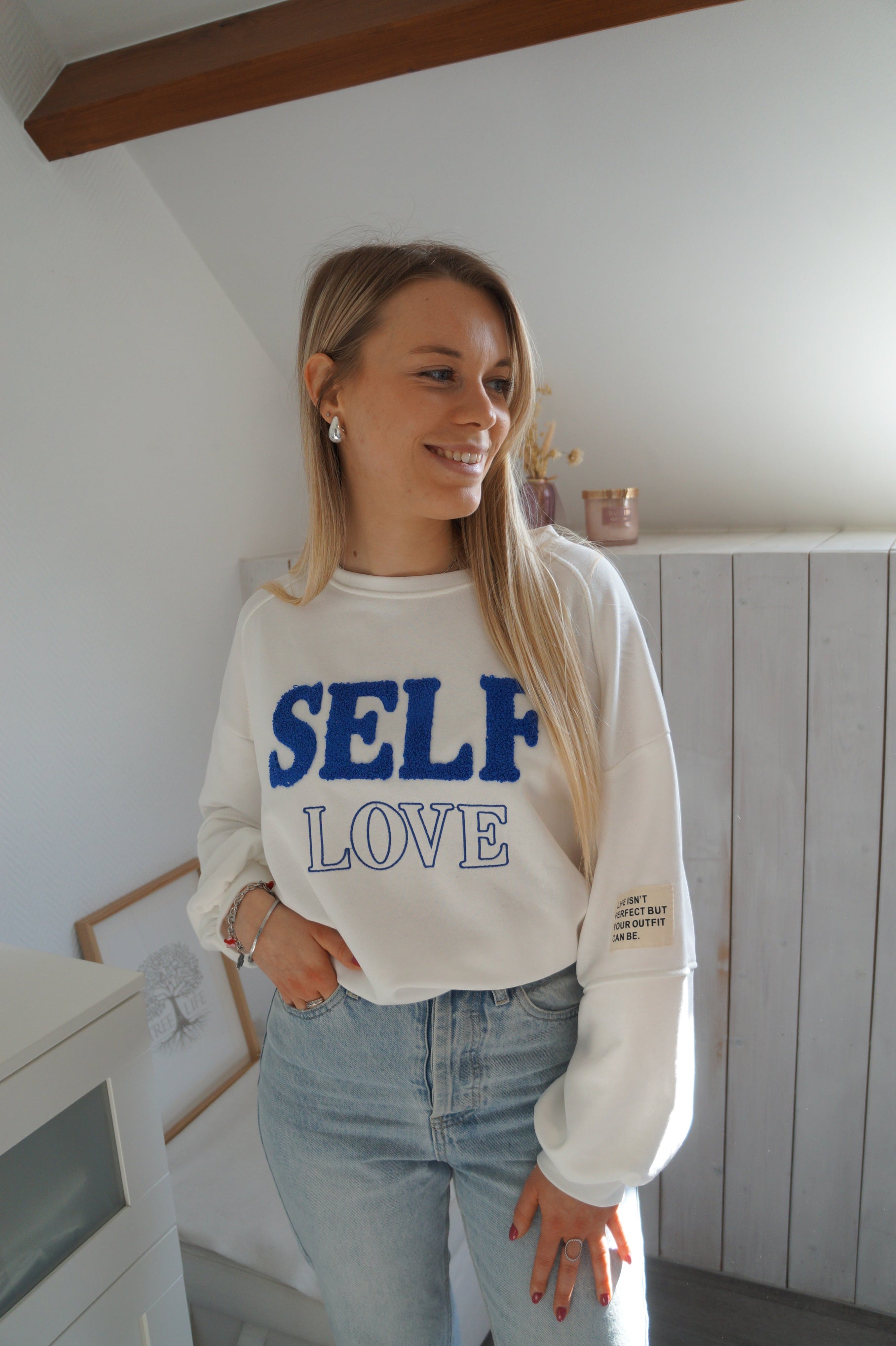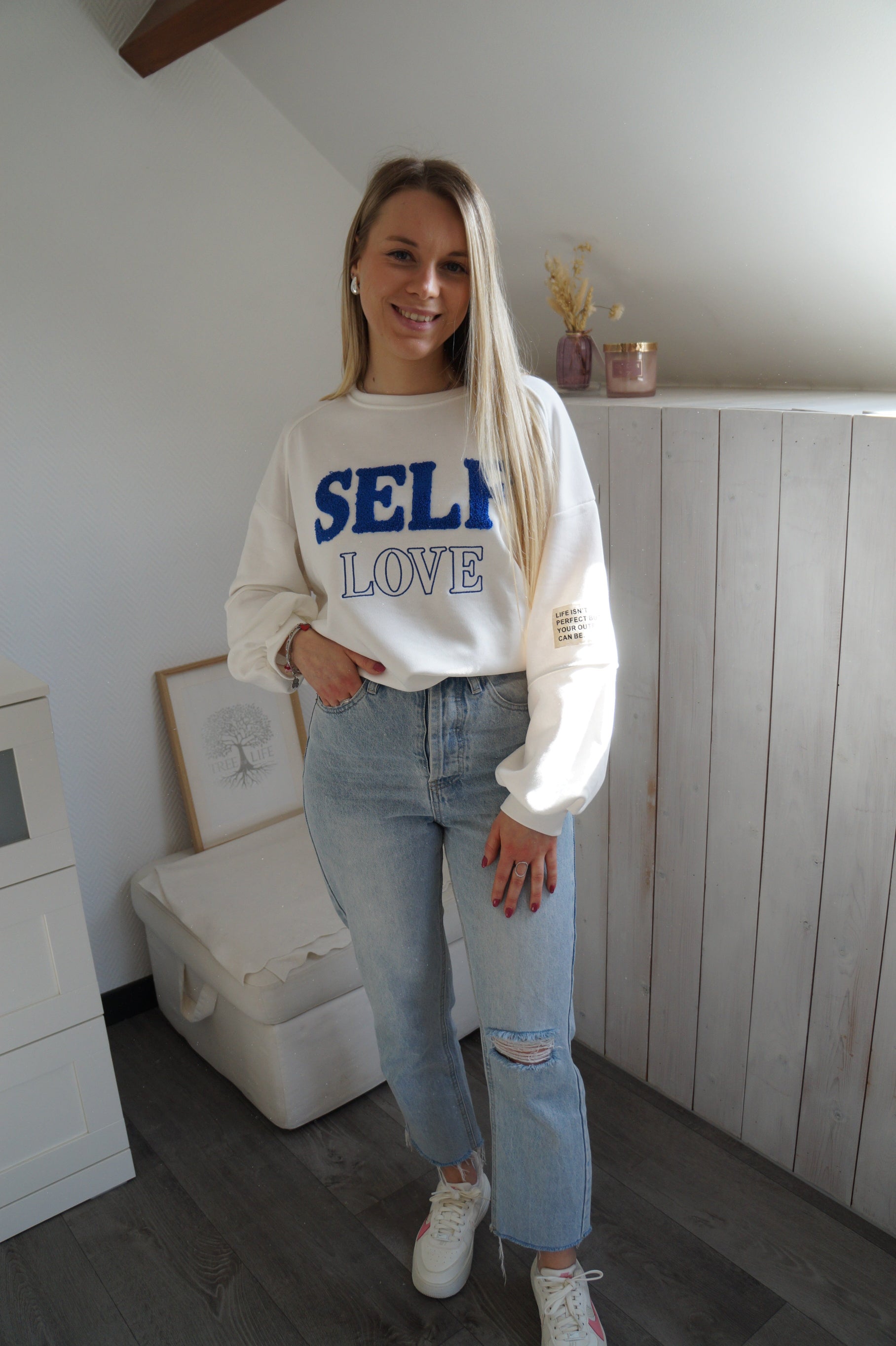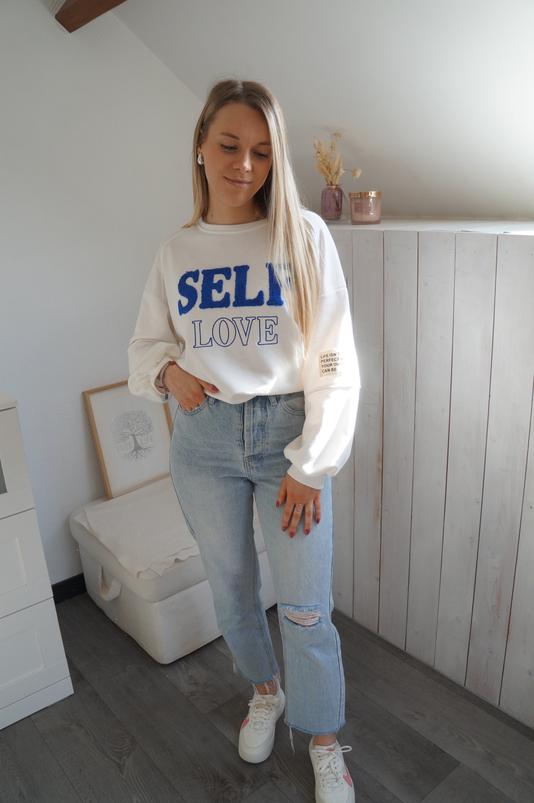 - Nos conseils Nosinya → un sweat oversize aux couleurs blanches et bleues, parfaites pour vos looks de ce printemps ! Notre sweat Self Love s'associe parfaitement avec votre jean clair préféré. Vous allez l'adorer pour son confort et son message qui nous rappelle de s'aimer soi-même ♡